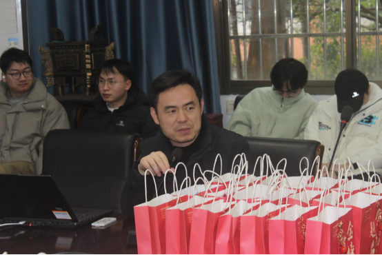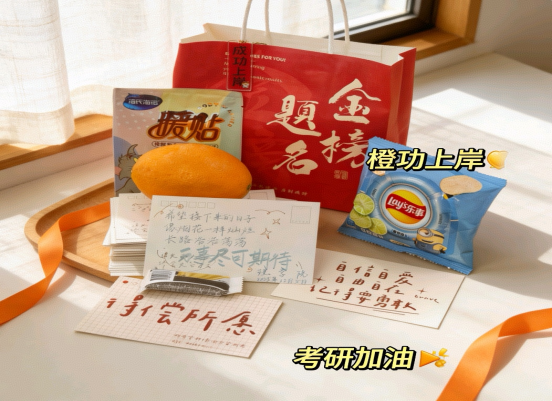 随后,学院领导与老师们向考研学子赠送了精心准备的暖心礼包。礼物设计别具巧思:励志书签寄托美好祝愿,“乐事”薯片寓意万事顺遂,香甜橙子代表心想事成,实用暖宝宝传递冬日温暖,更有低年级学生亲笔书写祝福贺卡,将全院师生的关爱与期盼送至每一位学子手中,为他们在寒冬中的最后冲刺注入了温暖与动力。