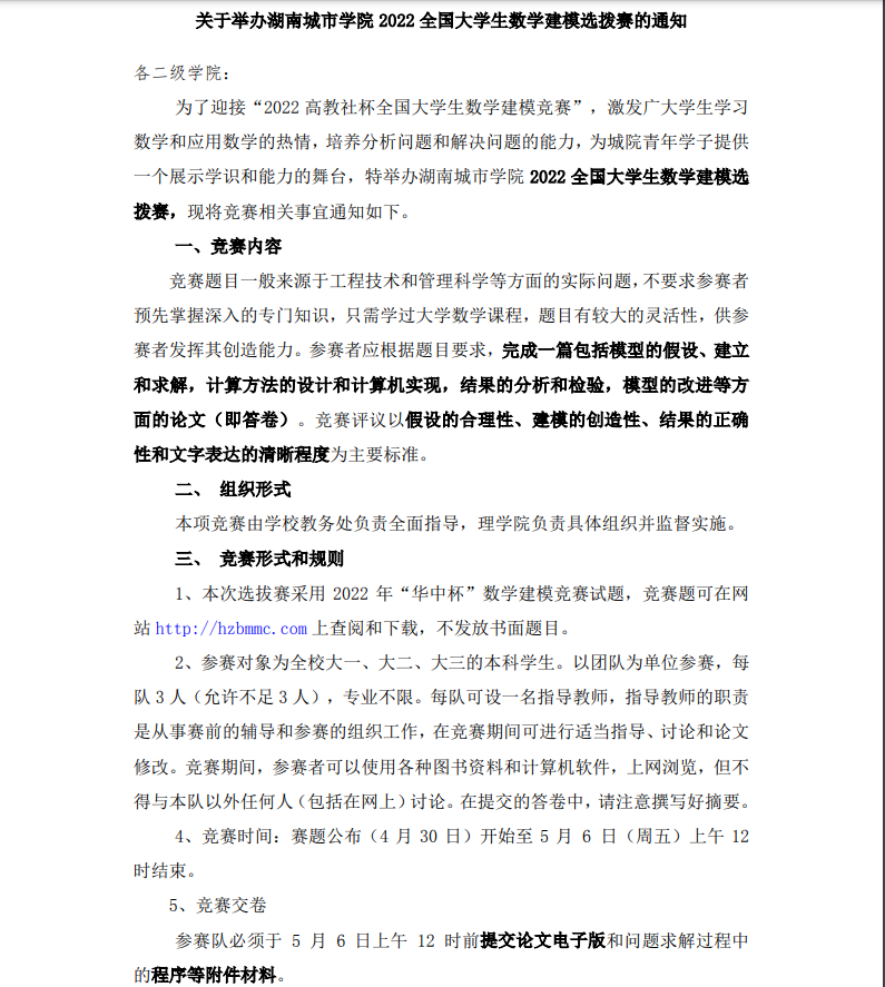 关于举办湖南城市学院2022全国大学生数学建模竞赛的通知