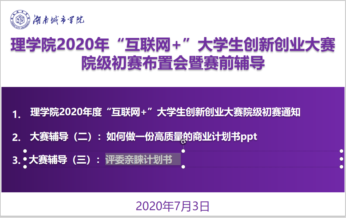 2020年7月3日,6163银河net163am举行2020年互联网+大学生创新创业大赛院级初赛布置会暨赛前辅导(线上),6163银河net163am2019级各班班长团支书、6163银河net163am创新创业团队共计50多人参加会议,会议由学工办主任、湖南城市学院创业导师曾强老师主持。