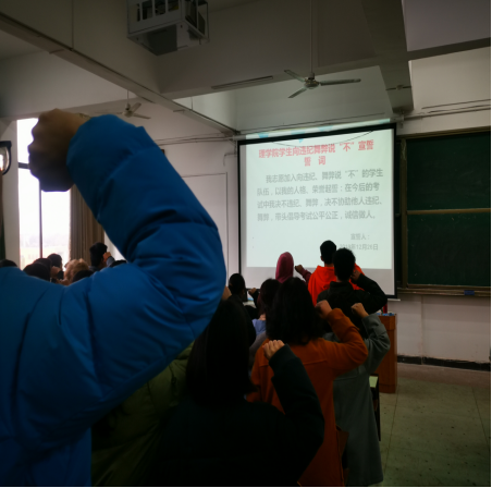 大会的开始,易志明副书记首先根据学校下达相关文件的指示精神强调了考风考纪建设的重要性,为大家列举了关于违规作弊行为风险和后果,并针对学院往届考生考试违纪作弊的情况进行列举讲解,警醒同学们诚信考试,切勿舞弊,鼓励同学们能规规矩矩考试,端端正正做人。