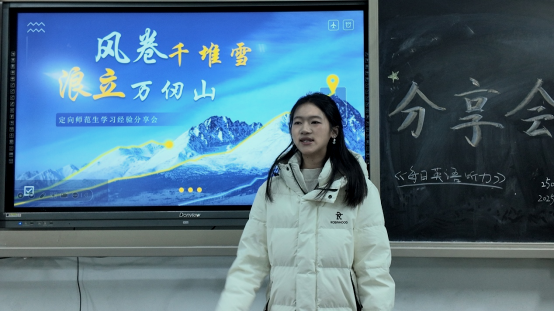 2309401班三位公费师范生代表结合自身经历分享心得:曾嘉琪聚焦综合能力提升,分享思维导图复习、目标分解等技巧,倡导“知行合一”;刘国栋围绕竞赛与关键考试,详解数学竞赛备赛及四六级、教资考试的高效备考策略;詹聪汝从教学设计、教姿教态等方面分享教学技能竞赛经验,建议制定清晰的成长路径,有方向地度过大学生活。